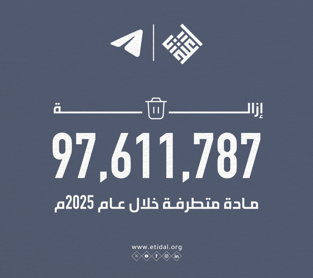 أثمر التعاون المستمر بين المركز العالمي لمكافحة الفكر المتطرف (اعتدال) ومنصة (تليجرام) في مجال مكافحة التطرف الرقمي عن نتائج خلال عام 2025م، تمثلت في إزالة 97,611,787 مادة متطرفة، إلى جانب إغلاق 4,294 قناة كانت تُستخدم لبث ونشر المحتوى المتطرف.